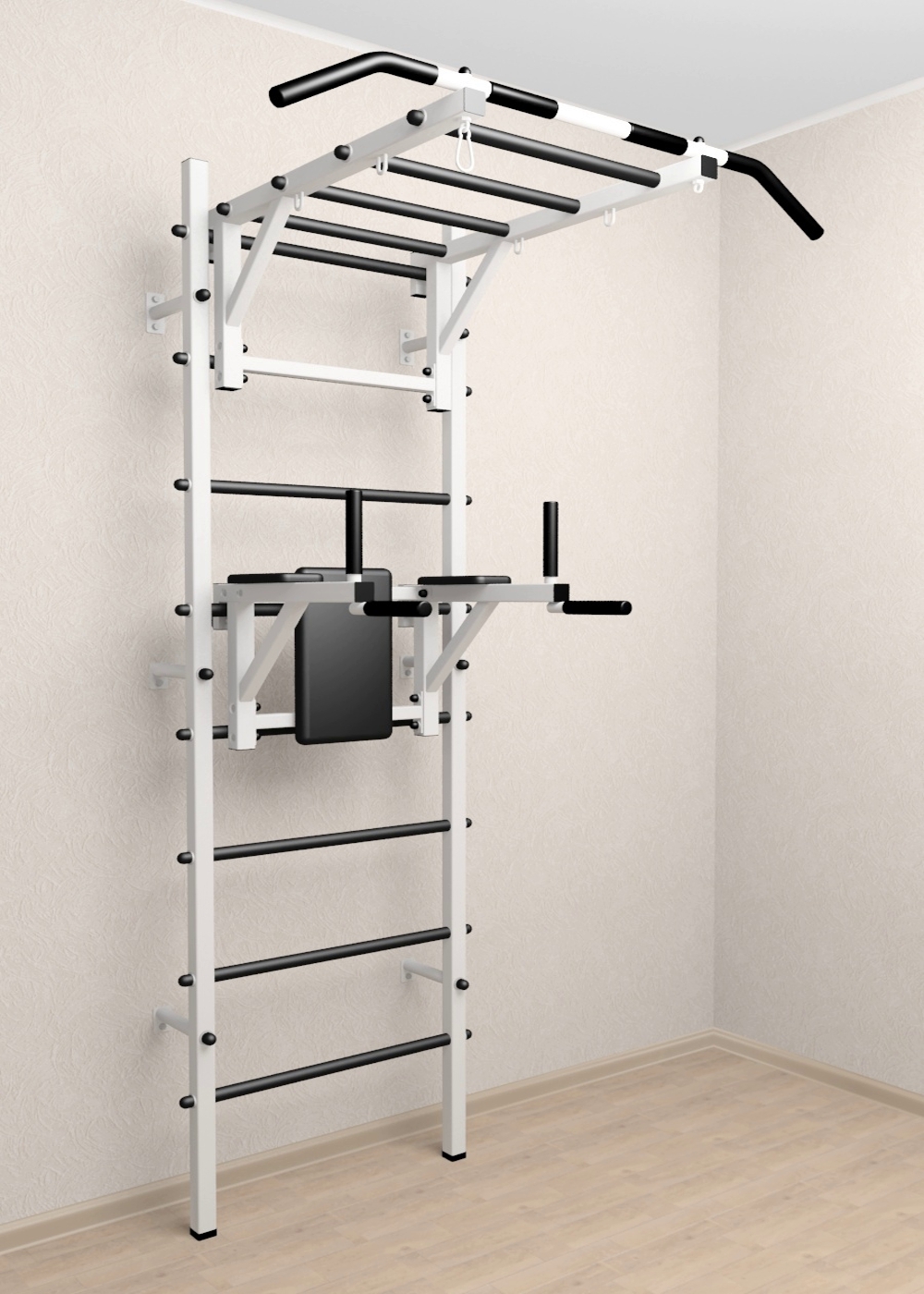 Стойки шведской стенки Sv Sport стандарт изготовлены из профильной трубы 40 х 40 х 2 мм. Ступени изготовлены из круглой, стальной трубы, покрытой резиной (не скользят, не натирают мозоли, не прокручиваются, не имеют запаха, приятны на ощупь). Устанавливается к стене при помощи 6 кронштейнов. На перекладину, в местах хватов, одеты резиновые ручки.
