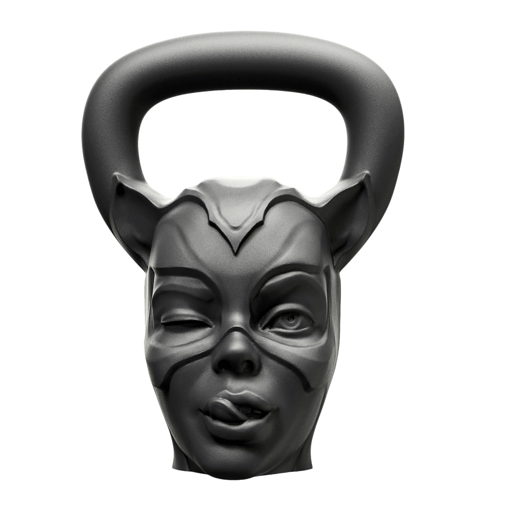 Гиря Кошка, масса 12 килограммов, цвет черный. Выполнена в виде головы Женщины в маске Кошки, оснащена удобной ручкой, идеально ложится в руку и отлично сбалансирована.