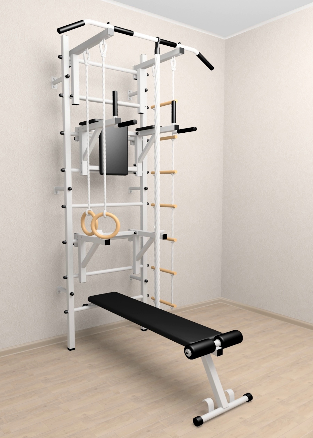 Стойки шведской стенки Sv Sport стандарт изготовлены из профильной трубы 40 х 40 х 2 мм. Ступени изготовлены из круглой, стальной трубы, покрытой резиной (не скользят, не натирают мозоли, не прокручиваются, не имеют запаха, приятны на ощупь). Устанавливается к стене при помощи 6 кронштейнов. На перекладину, в местах хватов, одеты резиновые ручки.